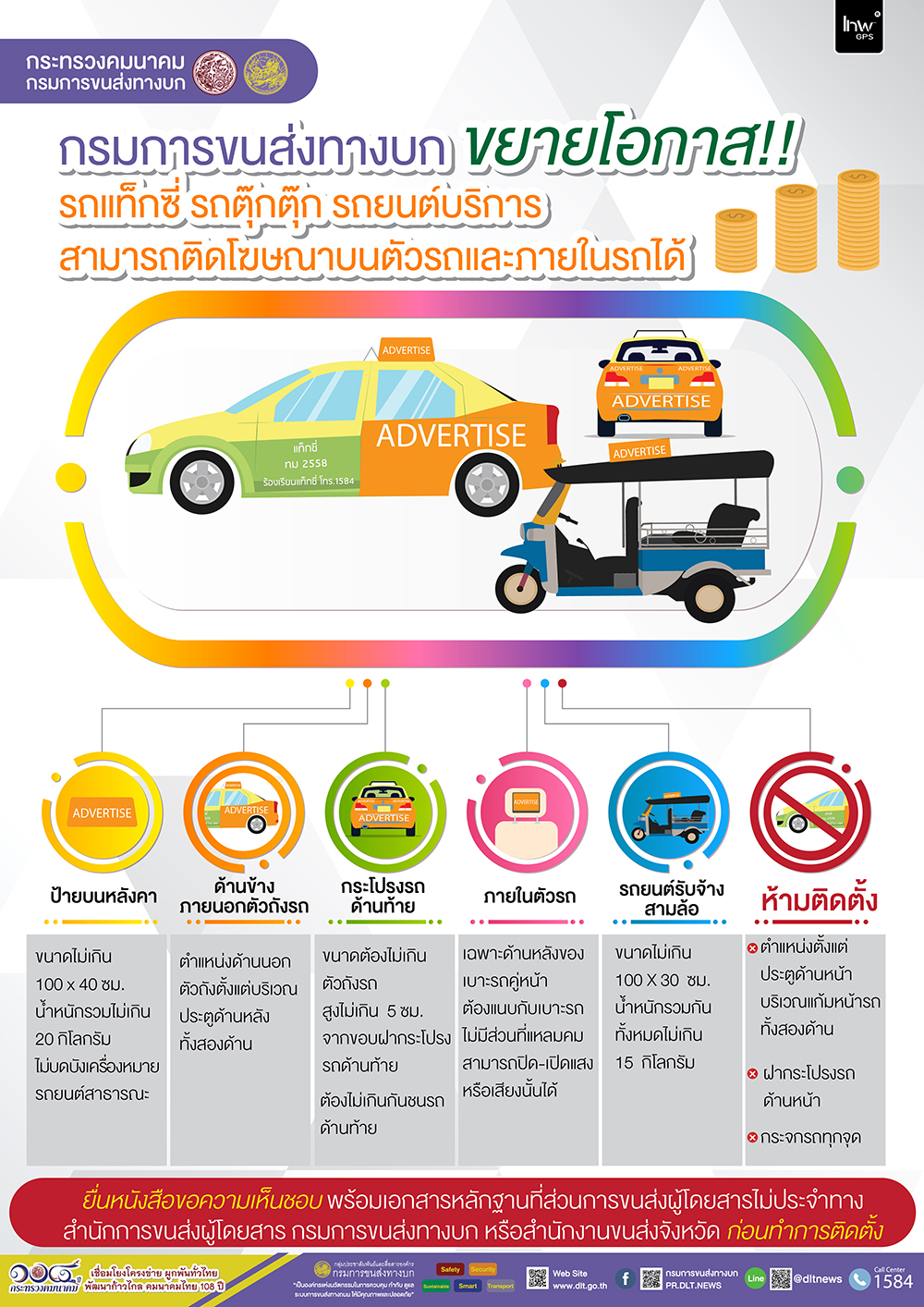 กรมขนส่ง ขยายโอกาส!! ให้ รถแท็กซี่ รถตุ๊กตุ๊ก รถยนต์บริการ (จำพวกรถสาธารณะ) สามารถติดโฆษณาบนตัวรถและภายในรถได้ ไม่ผิดกฎหมาย
